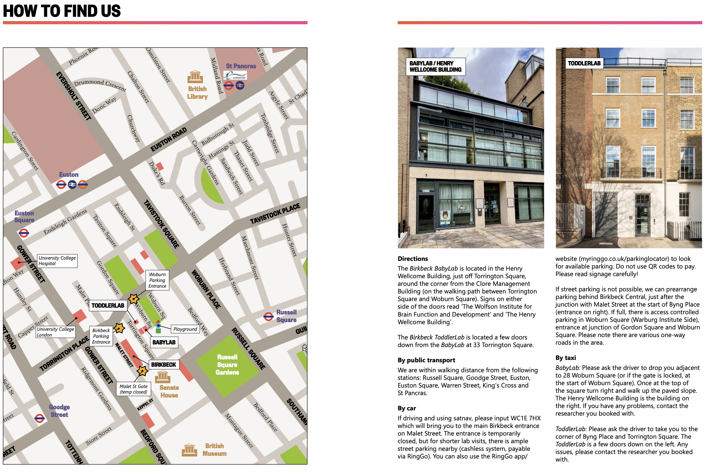 You can find us in the purpose-built, Henry Wellcome Building, which houses our main facilities and is home to the BabyLab. Our new ToddlerLab is located a few doors down from the BabyLab at 33 Torrington Square. Some of our Staff and students are located next door at 32 Torrington Square.